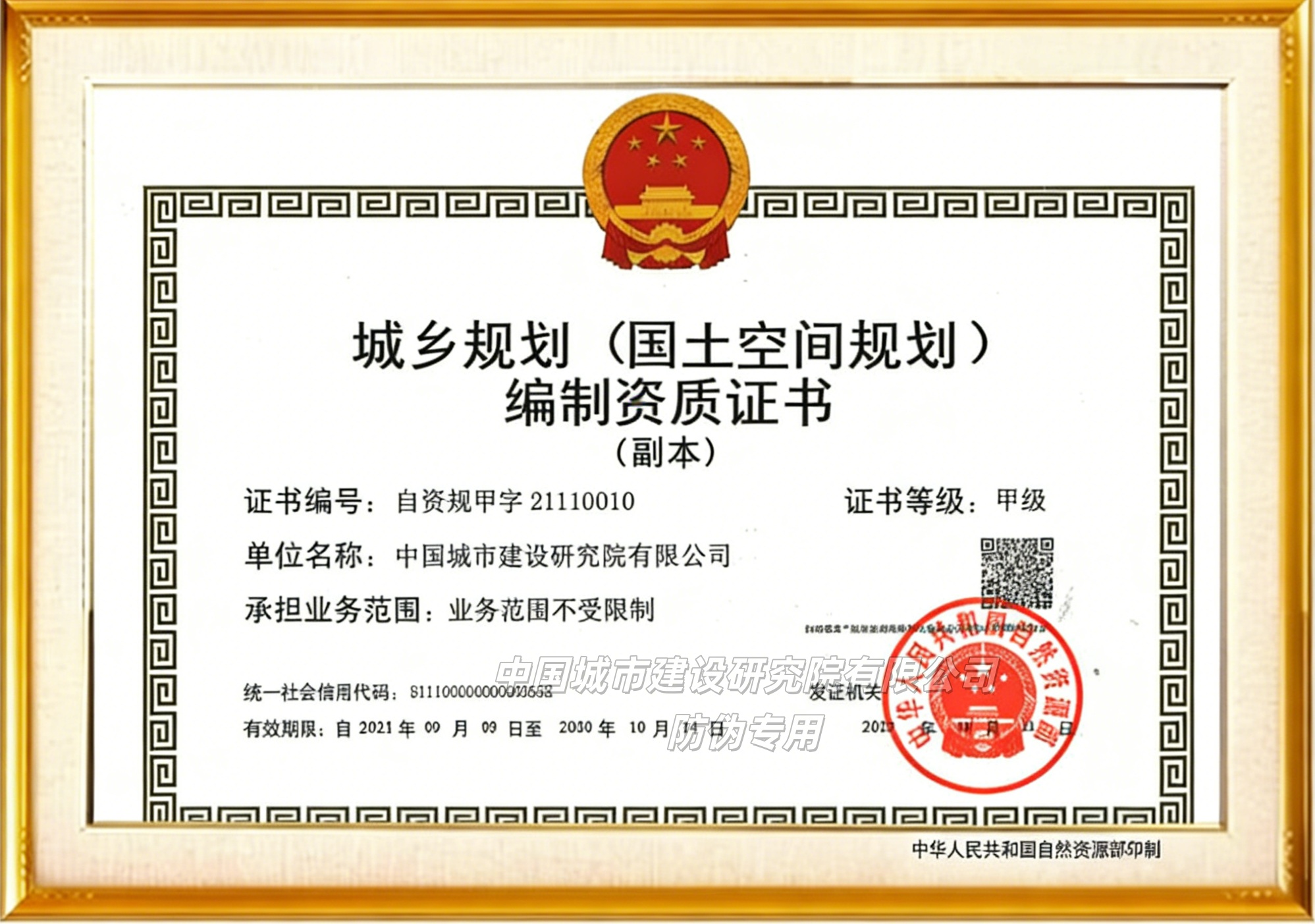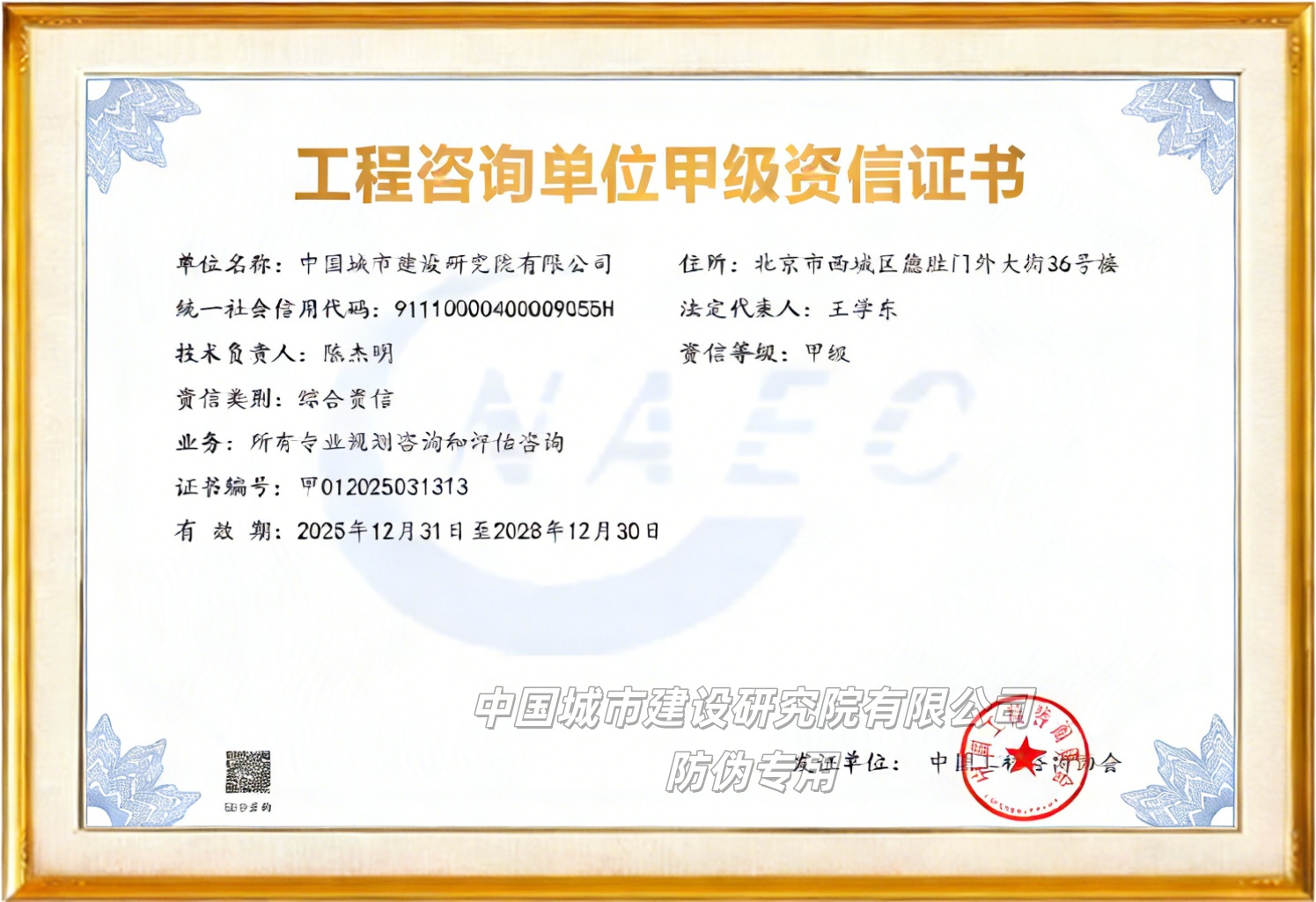 工程咨询单位甲级资信证书:综合资信